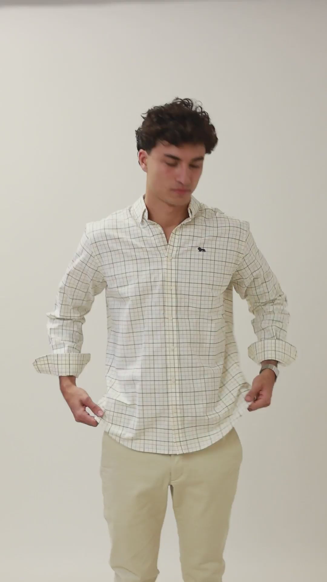Camisa estilo Countryside crema con cuadros verdes azules y naranjas.